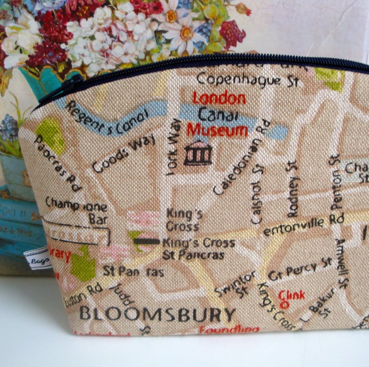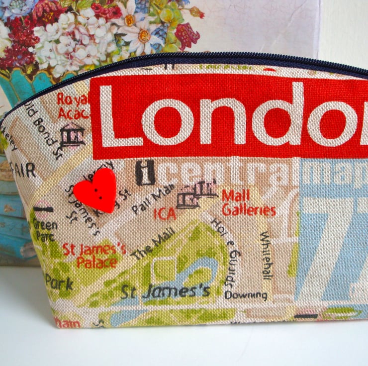 Made in a funky printed London map cotton fabric ( interfaced ) , front has been embellished with a pretty heart button .