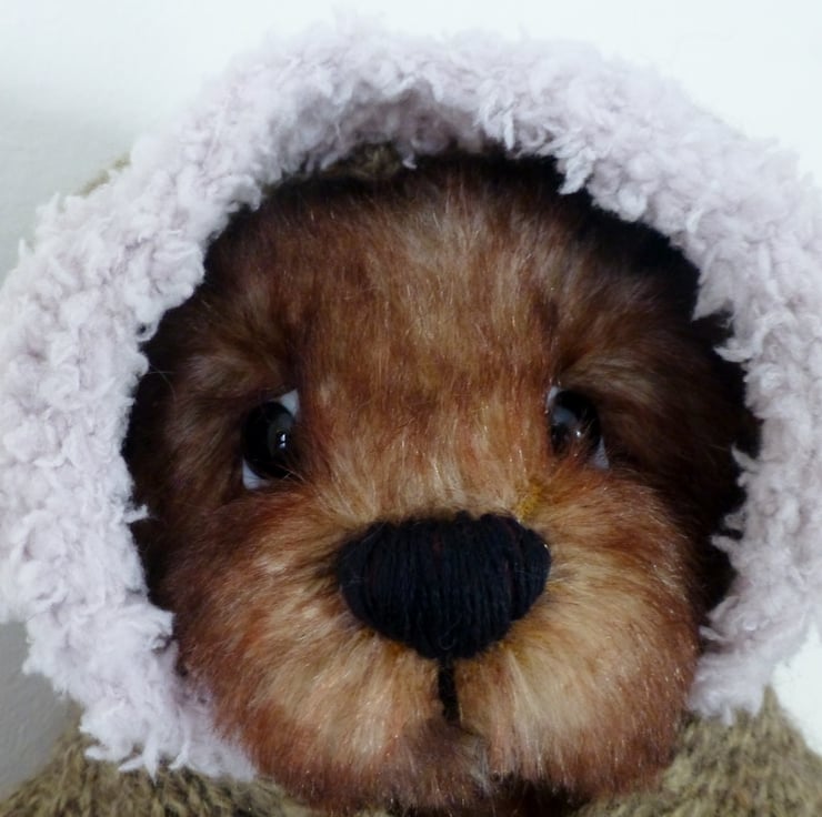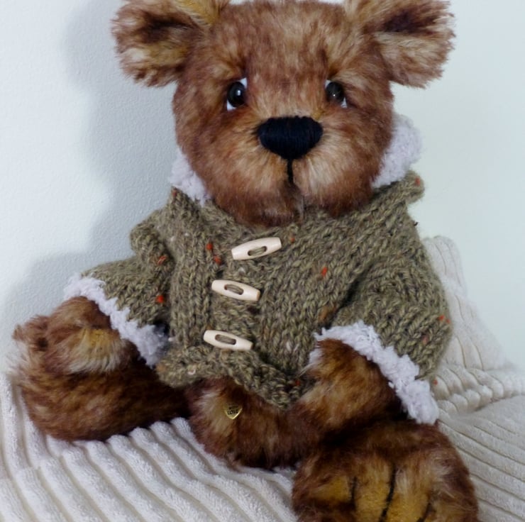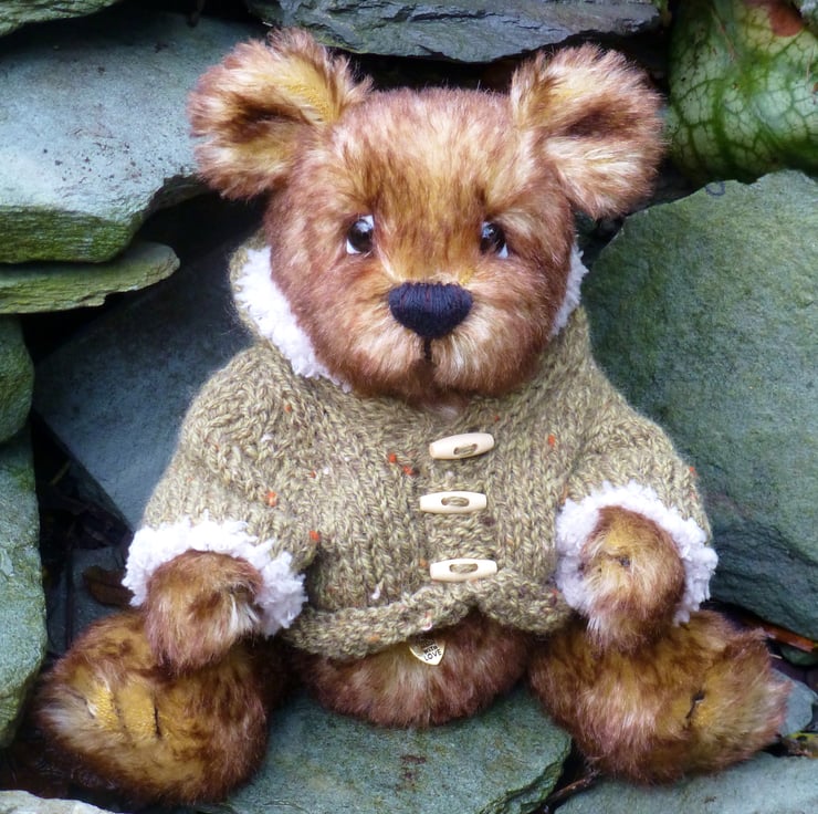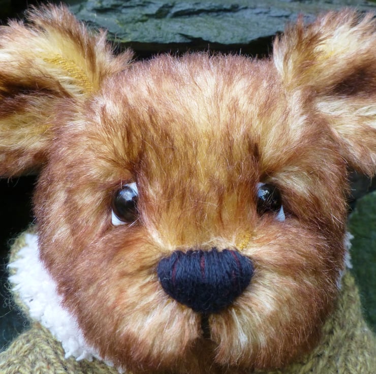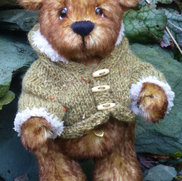 Branston is a one of a kind bear made from genuine mohair fabric. His unique expression is created using glass eyes and hand stitched features. He is fully jointed, with moving head, legs and arms and as with all Summertree bears Branston has a heart shape pendant sewn onto his belly. He is also wearing a hand knitted jumper to keep him warm. When sitting down he is approximately 20cm high.