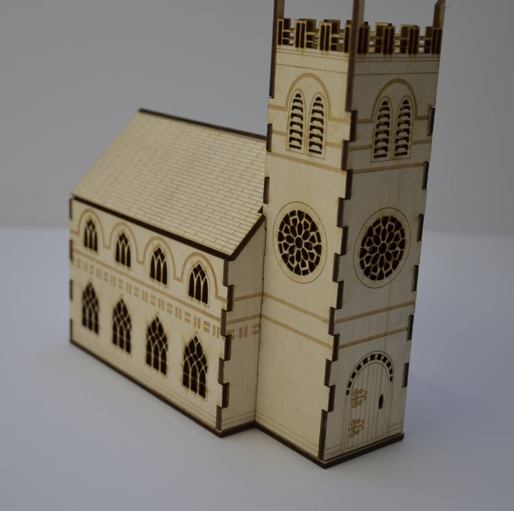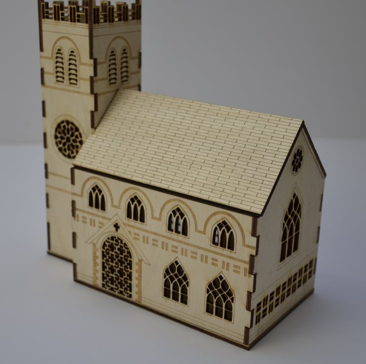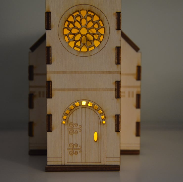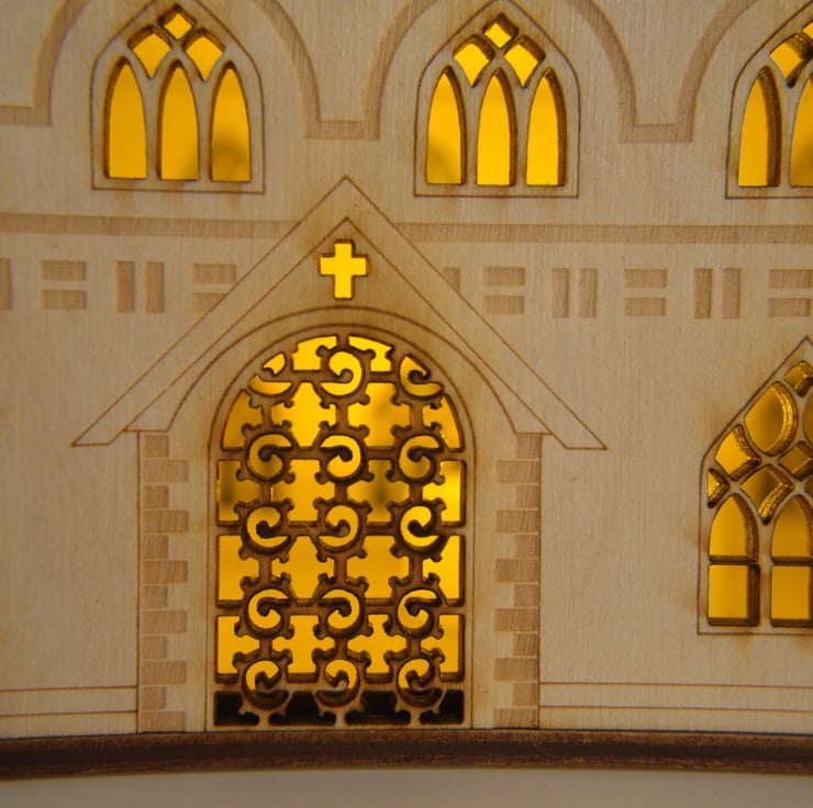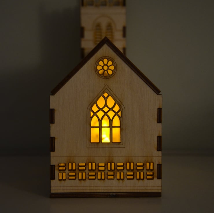 This laser cut church nightlight measures 170mm high. It has beautiful detail on each side including windows, doors and etched stone work.