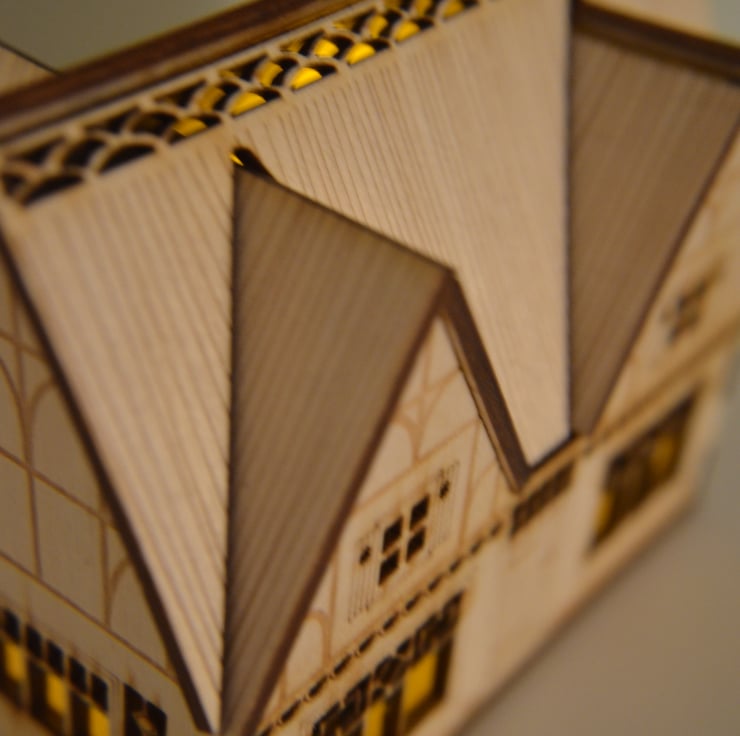 NEW for Autumn 2015, this laser cut thatched cottage nightlight measures 95mm high. It has beautiful detail on each side including quirky windows and shutters, doors and thatched gabled roof.