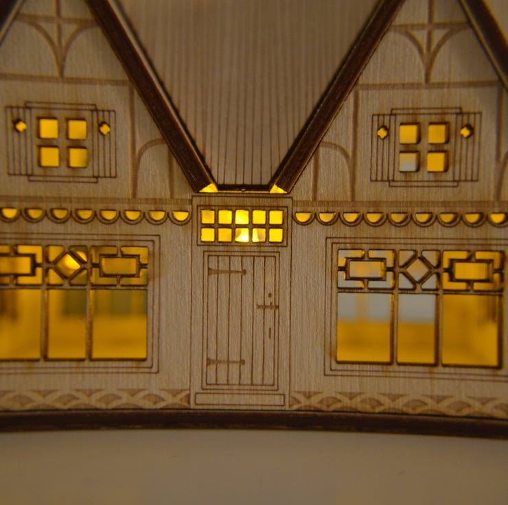 NEW for Autumn 2015, this laser cut thatched cottage nightlight measures 95mm high. It has beautiful detail on each side including quirky windows and shutters, doors and thatched gabled roof.
