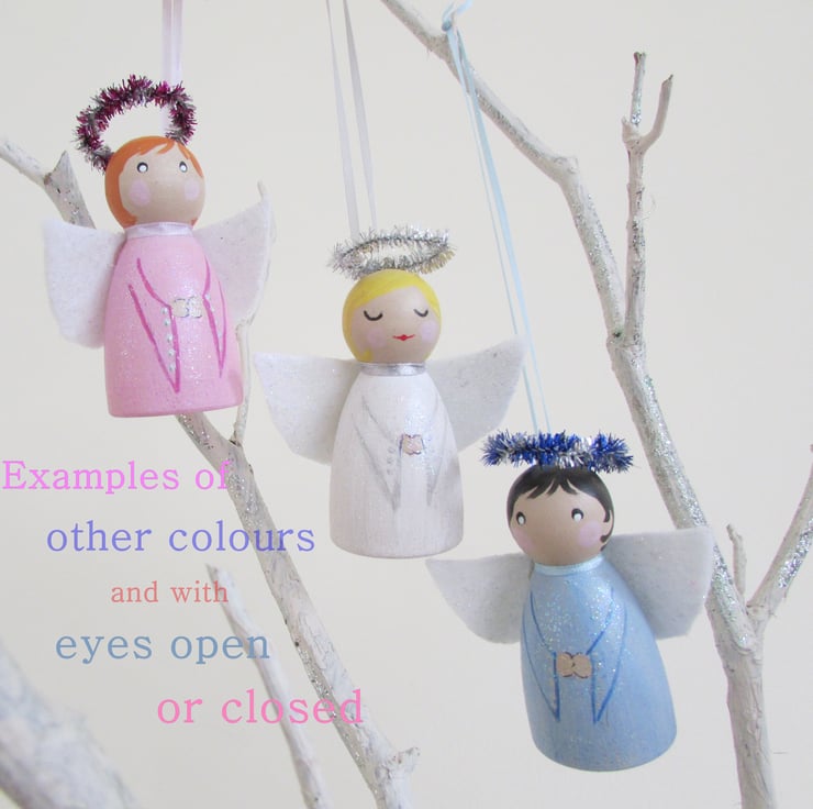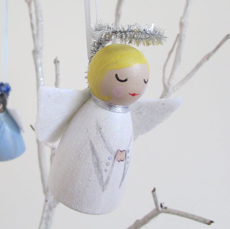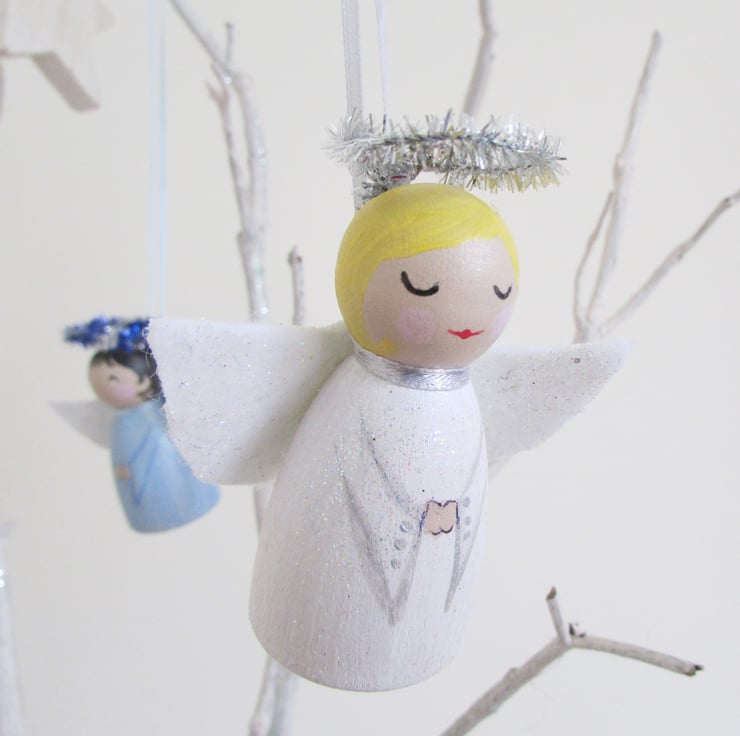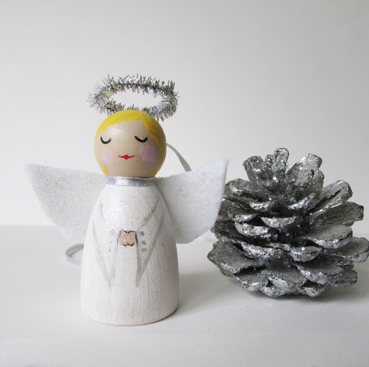 Peg Doll Christmas Angel. Handpainted, varnished and finished off with a shimmer of sparkle. The wings are made of felt and she has a sparkly halo. This Angel has a ribbon for displaying on your Christmas tree or she will look equally pretty sitting on a shelf.
