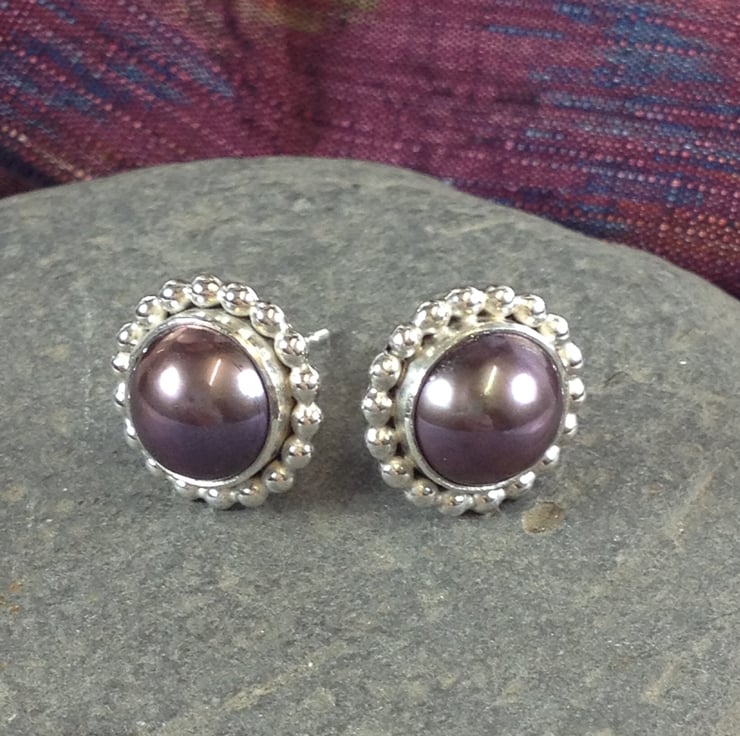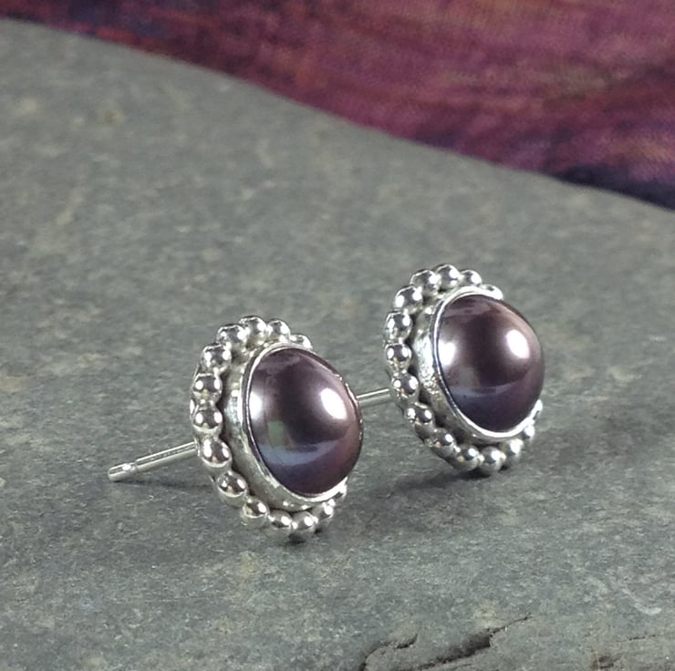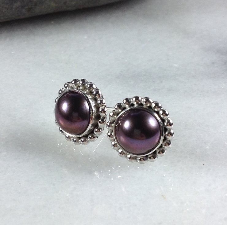 Large cultured pearl stud earrings in a plummy dark purple colour.