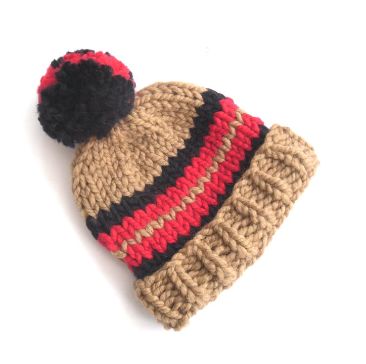 Knit in Tan Caramel & Tomato Red 80% acrylic , 20% wool yarn, with stripes in navy blue 100% wool !