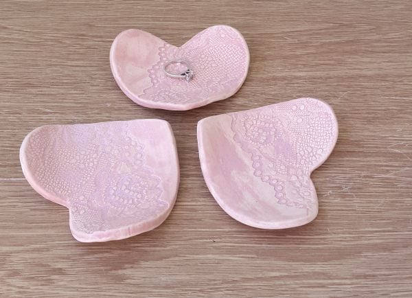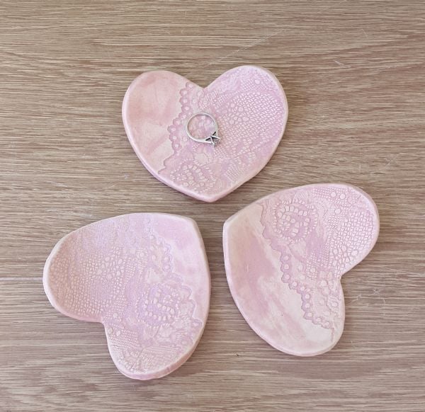 This trinket dish is impressed with a pretty lace texture and glazed in a pastel pink.