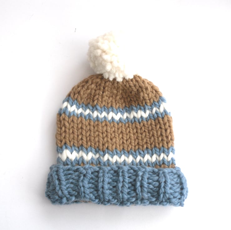 Hand knit thick and chunky striped beanie hat. Great for this coming winter. Will keep your head and ears super warm. Big 3.5" pom pom sits on the top of the hat.