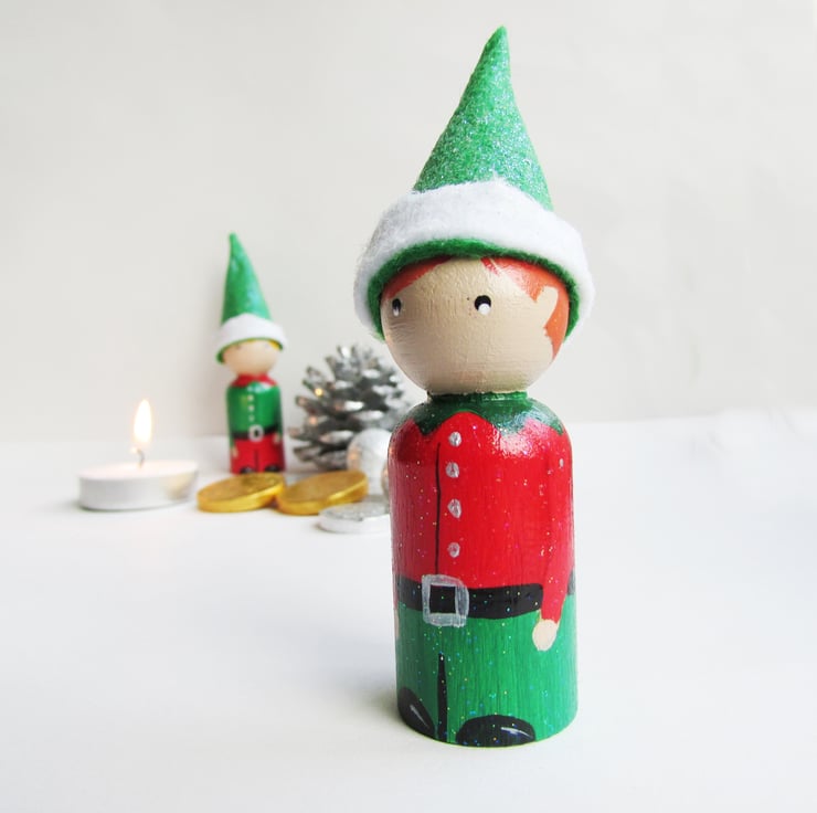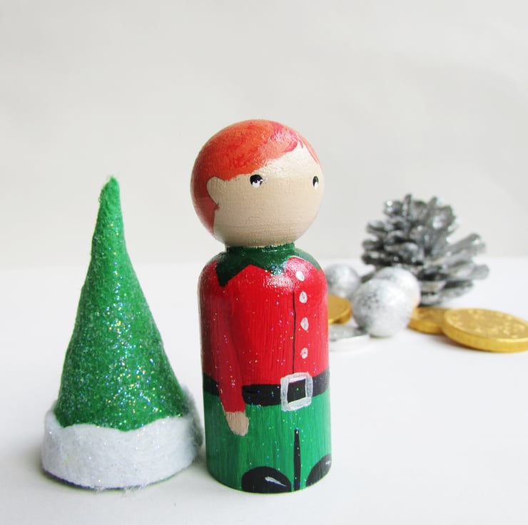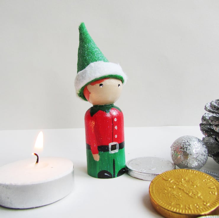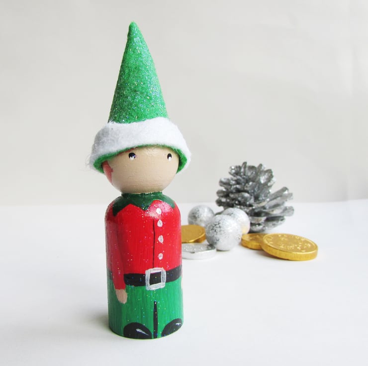Peg Doll Christmas Elf, he has been handpainted, varnished and finished off with a shimmer of sparkle.