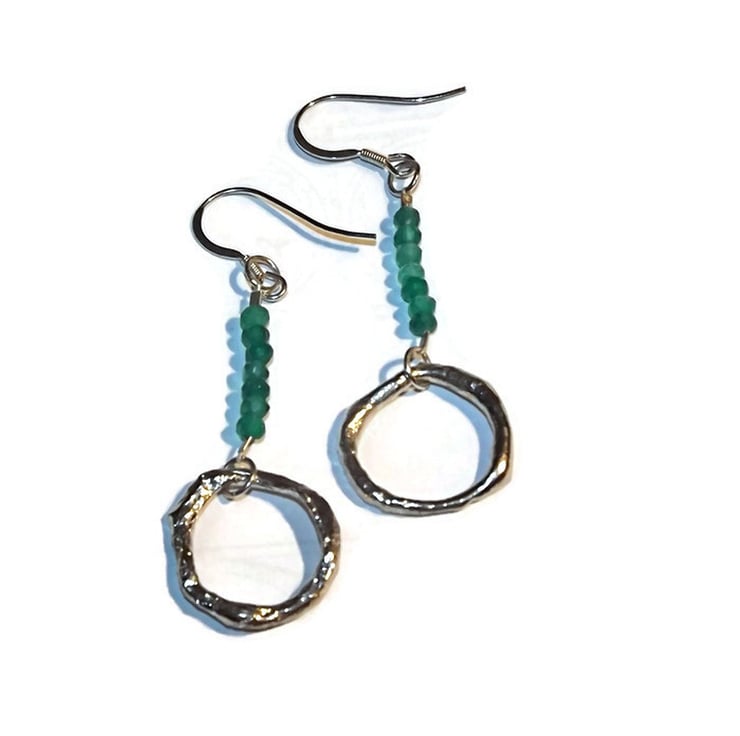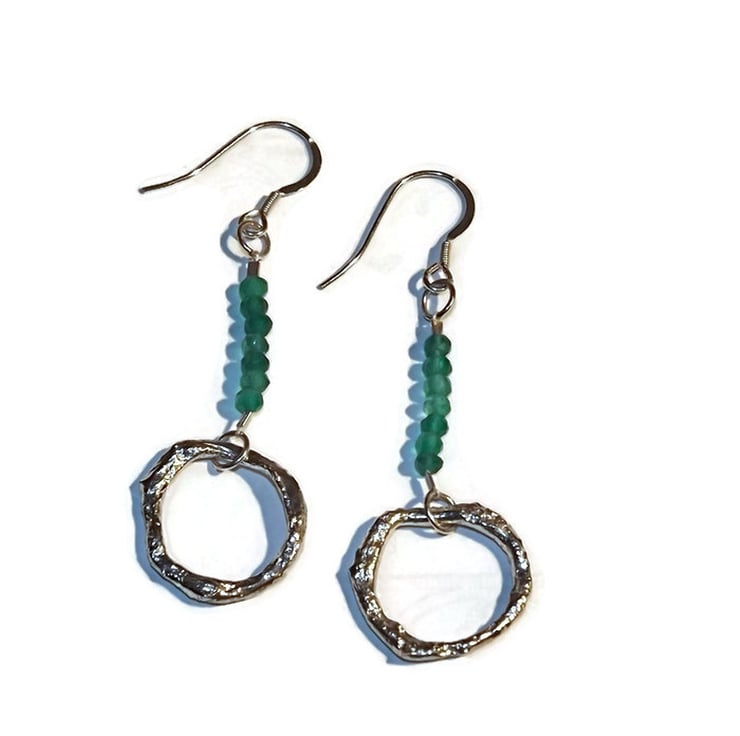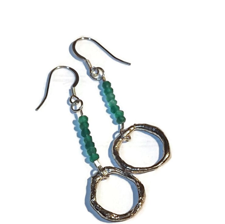This striking handmade pair of earrings features drops of natural 3 X 2mm faceted green onyx beads and hoops of reticulated sterling silver.
