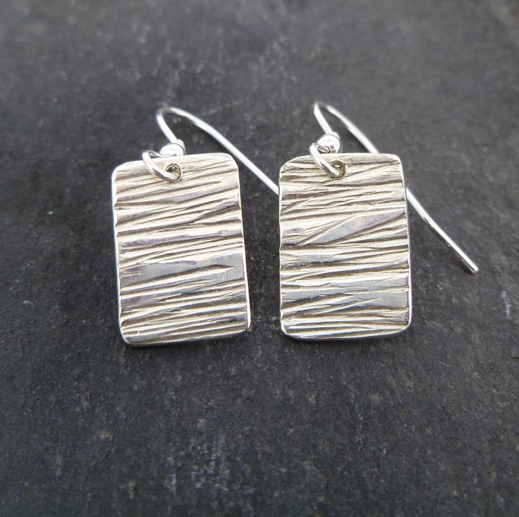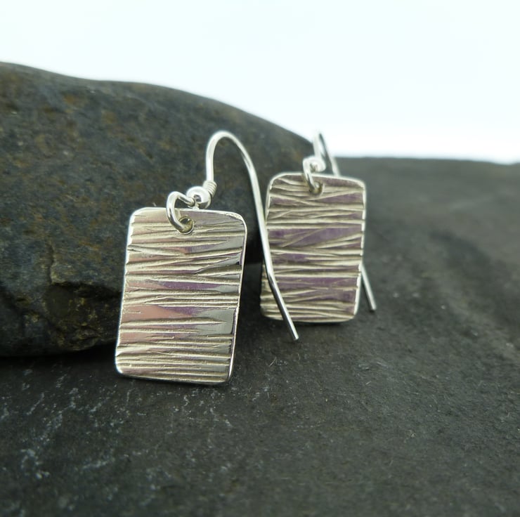 These lovely dainty ear-rings are made from sterling silver sheet, textured by hand and attached to sterling silver hook wires. These ear-rings compliment the textured pendant also available.