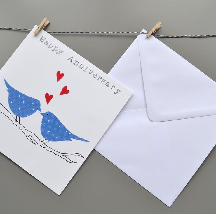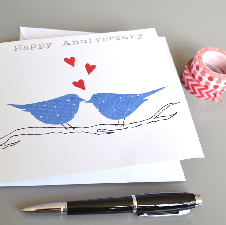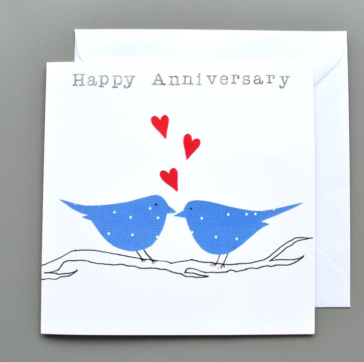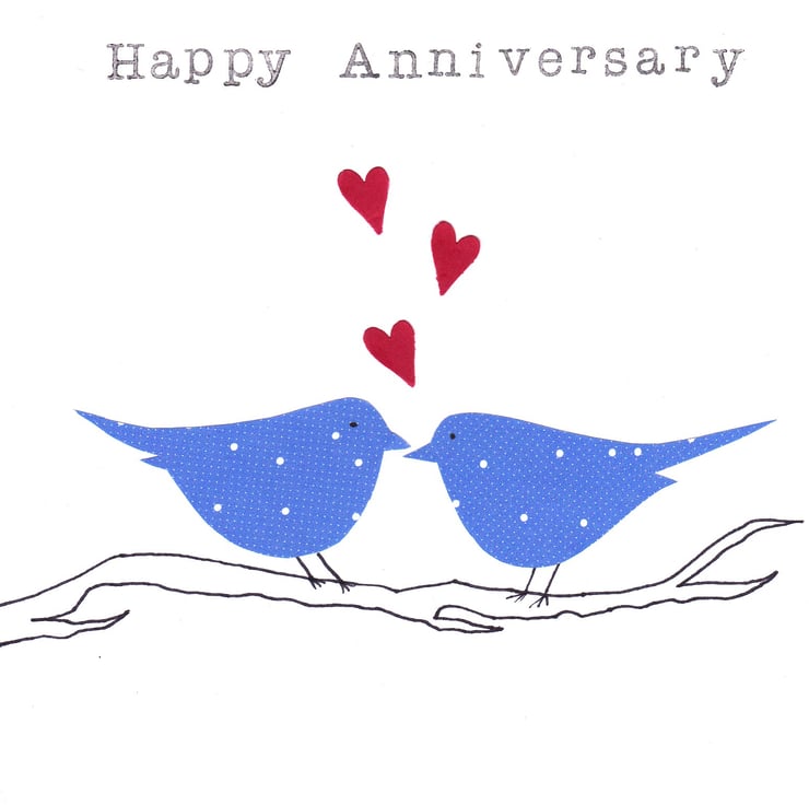 Anniversary card showing two blue spotty birds facing each other on a branch with three red hearts between them.