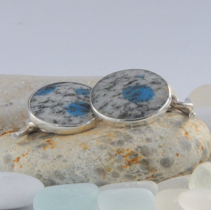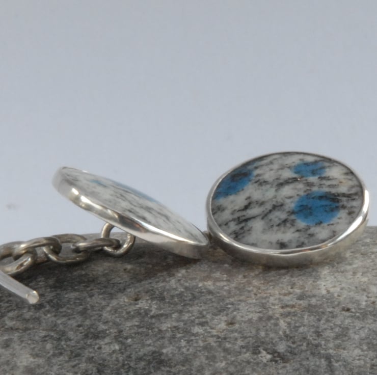 These sterling silver cufflinks feature rounds of K2 granite (also known as K2 jasper) with its distinctive pattern of bright blue azurite spots on a mottled white and black granite background. K2 granite is so named because it is only found near K2 (the second highest mountain in the world) in the Karakoram Range in Pakistan so these would make a wonderful gift for the mountaineer / explorer in your life. The cufflinks have been finished with hand made chain and bar backs.
