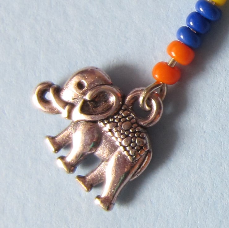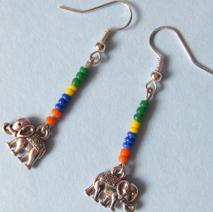 Elephant charms and green, yellow, blue and orange beads threaded onto silver plated wires. They measure 3.5 cm long and the elephant charm measures 1 x 1.5 cm.