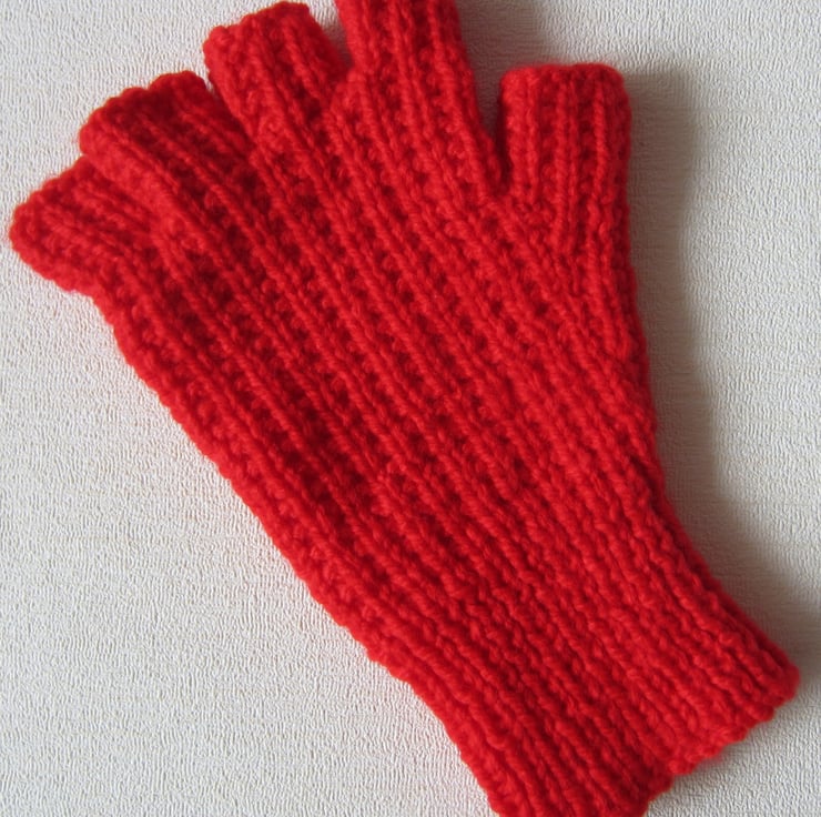 Hand knitted fingerless gloves in bright Christmas red. Suitable for medium ladies to small men's hands. They measure 21.5 cm long and 11 cm wide (un-stretched).