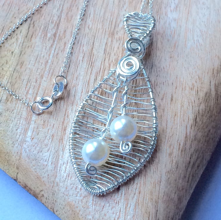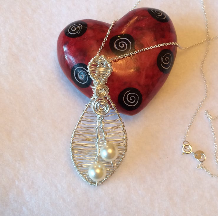 A sterling silver pendant with beautiful Swarovski crystal pearls on twisted silver. I have designed this pretty pendant using wire wrapping and weaving techniques. The pendant comes with a 45cm (18") sterling silver chain.