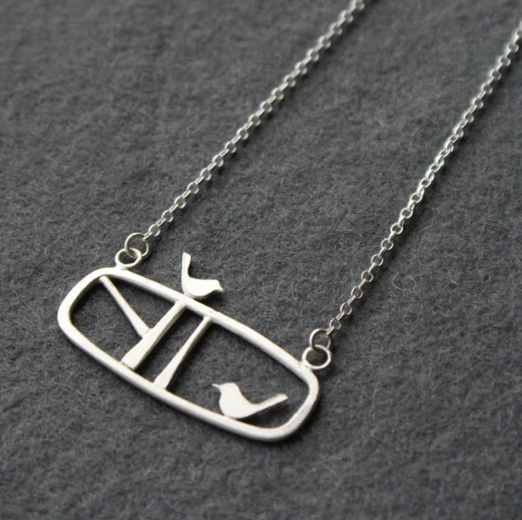 A lovely necklace featuring a little line of stylized trees with a bird on each side. Soldered within a hand forged rectangle suspended from an adjustable sterling silver chain. The finish is a lovely frosted texture which has a subtle sparkle and is slightly rough to the touch. Please note each piece is entirely handmade and may vary slightly from the image.
