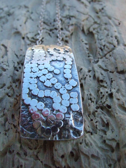 It has a series of silver balls soldered on to the piece which have then been rolled into the surface and then a dark patina applied to make the balls stand out.