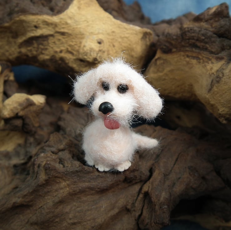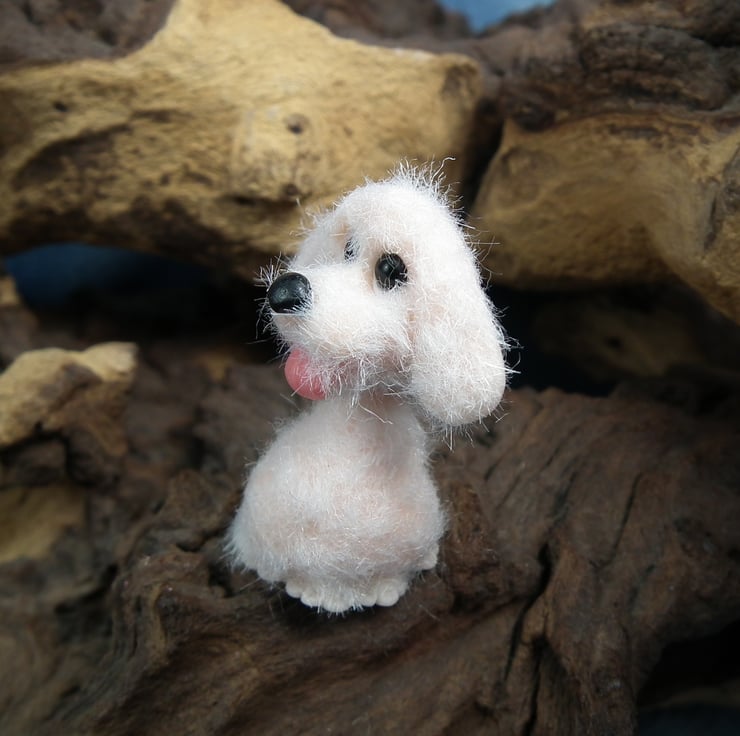 Modelled without the use of moulds from Prosculpt. After blushing, Rafferty has been carefully fur flocked with the softest mohair in two lengths. Rafferty has stunning black onyx eyes which sparkle and shine so realistically that his gaze seems to follow you. He is just adorable in the palm of your hand with his pink tongue lolling. Rafferty features a unique head joint allowing his head to be gently re-positioned from side to side. A 'one of a kind' creation, Rafferty the little fuzzy puppy is just one and a half inches high and would make a delightful and unique addition to your miniature collection.