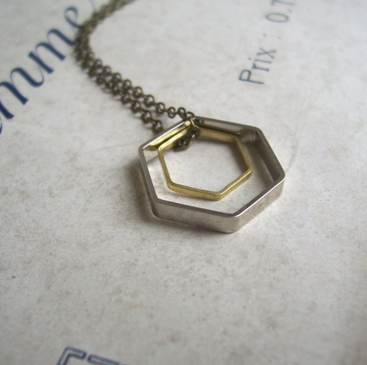 These delicate pieces are layered on super fine bronze chain to create a beautiful geometric necklace. Silver plated hexagon with a smaller golden brass circle inside. Each moves separately on the chain. Beautifully minimal.