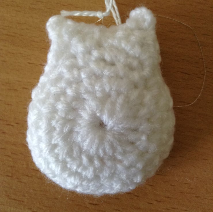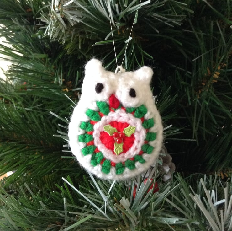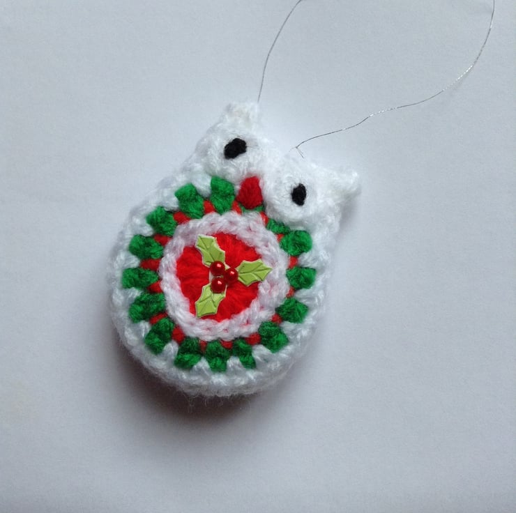 Cute little owl Christmas Tree decoration crocheted with green,white,and red acrylic yarn,decorated with a sprig of holly and hanging from a silver thread.