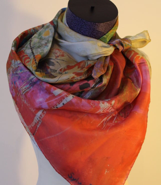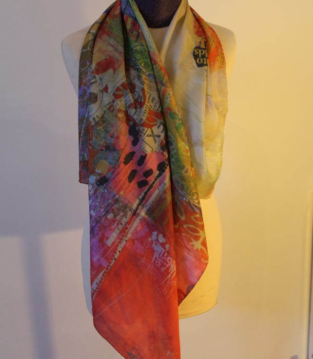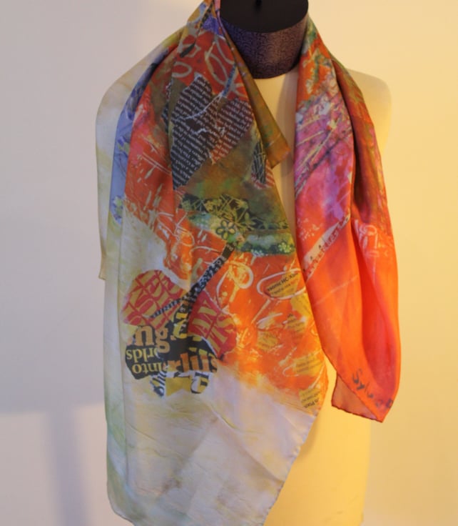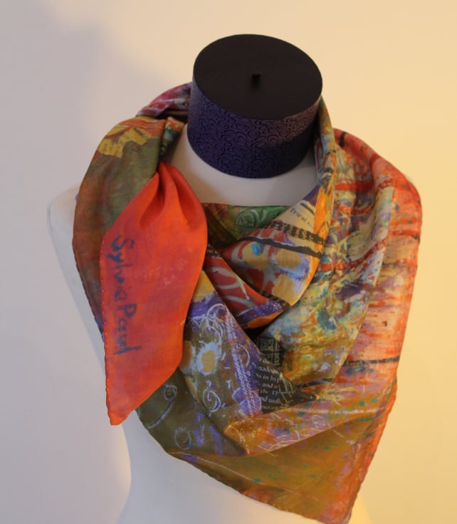 "Fall" is a digitally printed silk scarf. It measures 100 cm square and the image is from one of my original acrylic and collage paintings. The 100% Habotai silk has a soft feel and drapes well with some of the colour showing through on the reverse. I am very pleased with the gorgeous colour and detail of this printed scarf and it would be a versatile addition to any outfit. The colour can be bold or subtle depending on the way the scarf is folded. The large size allows you to try different ways of wearing the scarf. The edges are hand rolled. Gentle dry cleaning is recommended. I do not have a large stock of these scarves and will order them as required so please allow 14 day but I will try to post it as soon as possible.