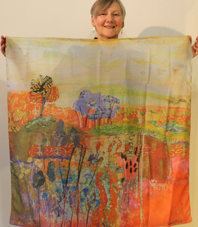 "Fall" is one of my original acrylic and collage paintings printed on the silk. I have been painting for nearly 40 years and regularly show my work in UK and have exhibited in Japan. I have often thought that my artwork would look good printed on fabric and I am not disappointed with this product. The colour is amazing and the effect of the collage gives an original effect.