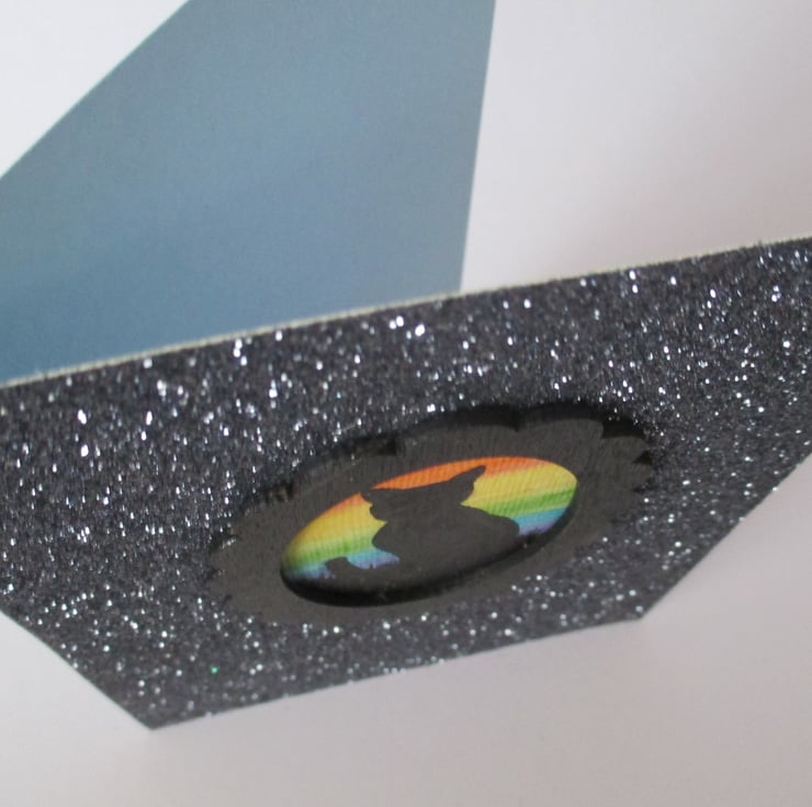 The picture is an original acrylic painting, with a wooden frame, painted black. It is mounted on a glittery grey/dark silver background. The card is light blue on the inside and reverse, it is left blank for your own message.