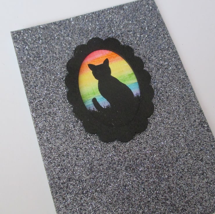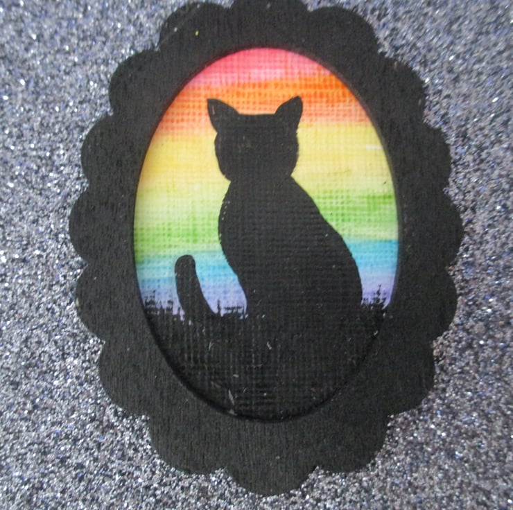 It has a hand painted mini painting on the front of a pussy silhouetted against a rainbow sky.