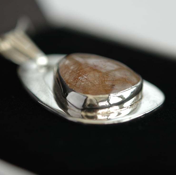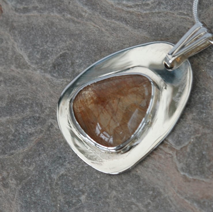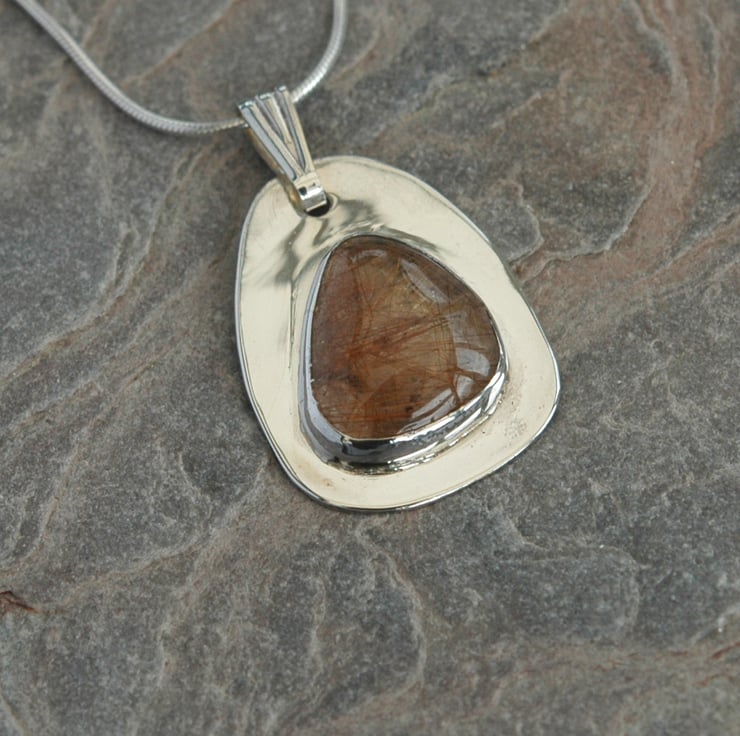 This beautiful sterling silver pendant features a freeform cabochon of rutilated quartz - a crystal clear gemstone displaying a three-dimensional array of 'golden arrows' within it.