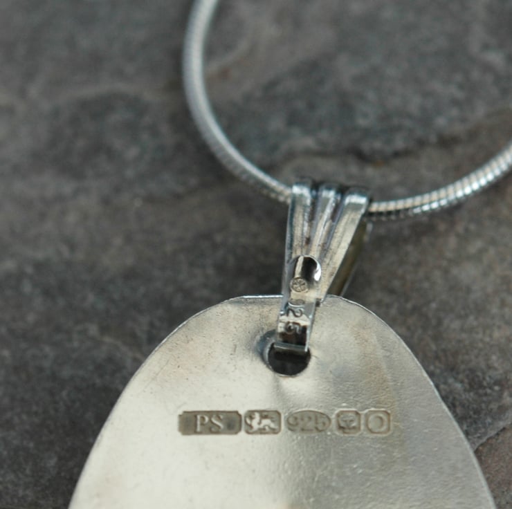 The pendant measures approx 2.8 x 2.2cm and weighs 6.2g. The silver has been polished to a high shine. Traditional silver hallmarks including my own maker's mark have been applied to the reverse side by the London Assay Office. A sterling silver fluted bail and a 16in (40cm) sterling silver snake chain will be supplied with it.