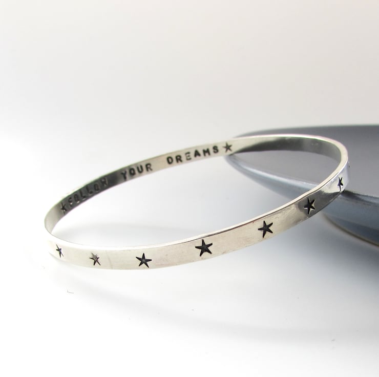 Each bangle can have 55 characters hand-stamped on the inside of the bangle. You can choose exactly what you would like. Your chosen words are hand-stamped in capital letters. You can have words and numbers. Punctuation signs which can be included are '&' and a full stop. You can also have a heart or star.