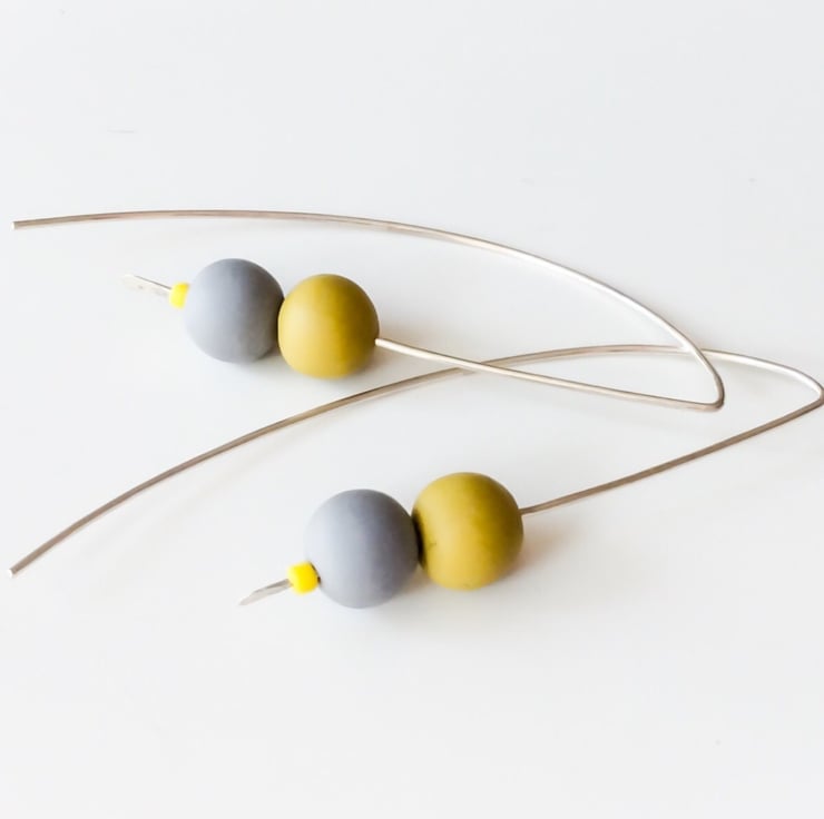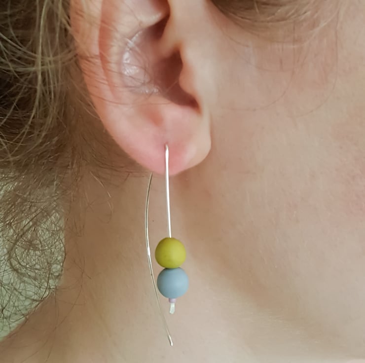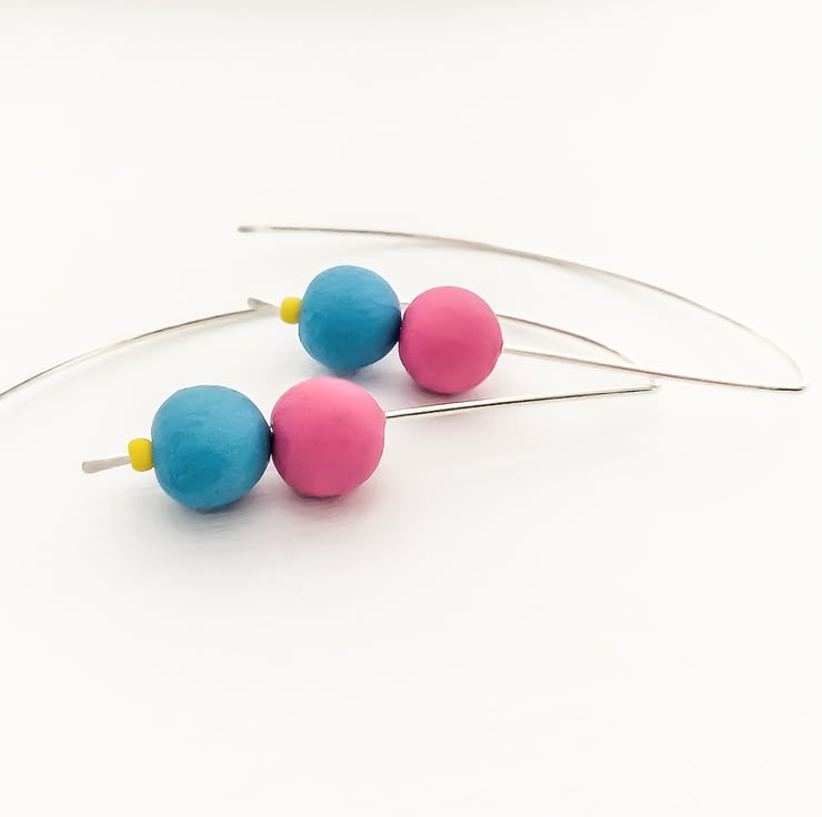 These contemporary earrings are elegant, colourful and lots of fun. They are made from sterling silver wire and I have added two handmade polymer clay beads in a choice of lovely custom mixed colours.