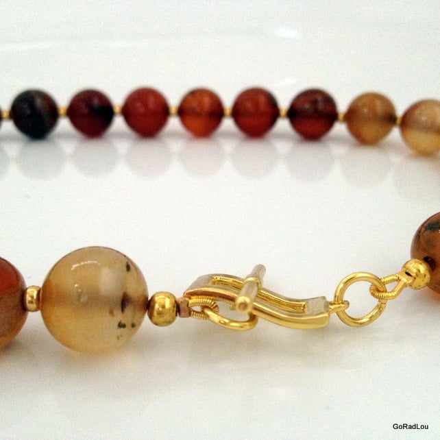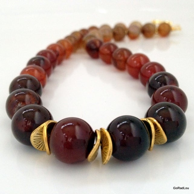 This set features 12mm rounds of dark caramel banded agate with gold coloured seed bead spacers. The front section of the necklace has gold plated wavy spacer beads to create an interesting piece.