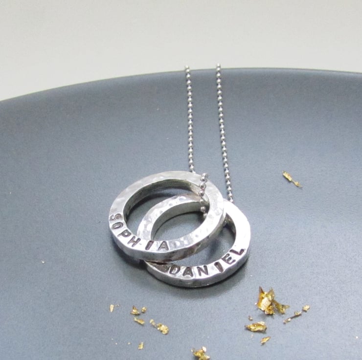 Keep your loved ones close to your heart with this simple silver names necklace. These chunky little circles can be stamped on either side with names, meaningful dates, places or a simple message, the choice is yours!