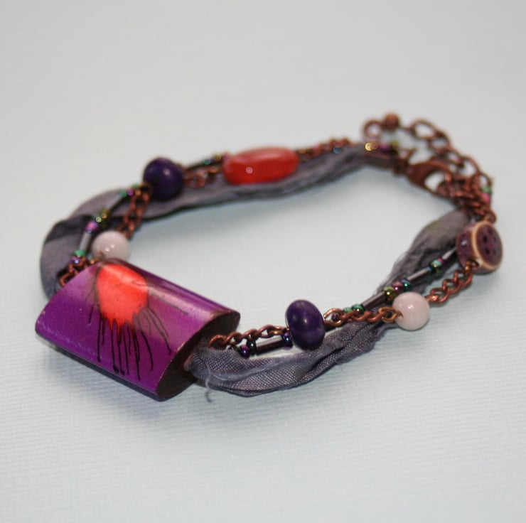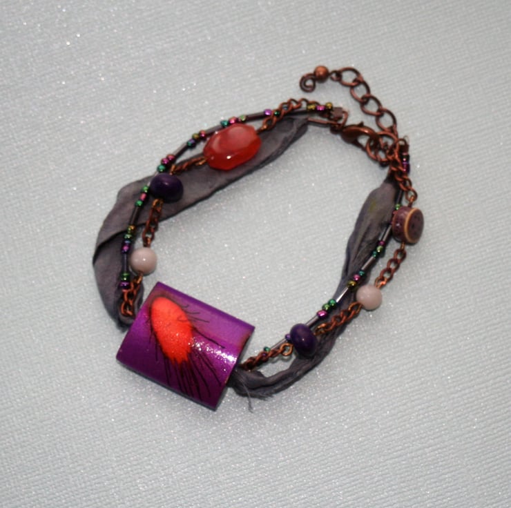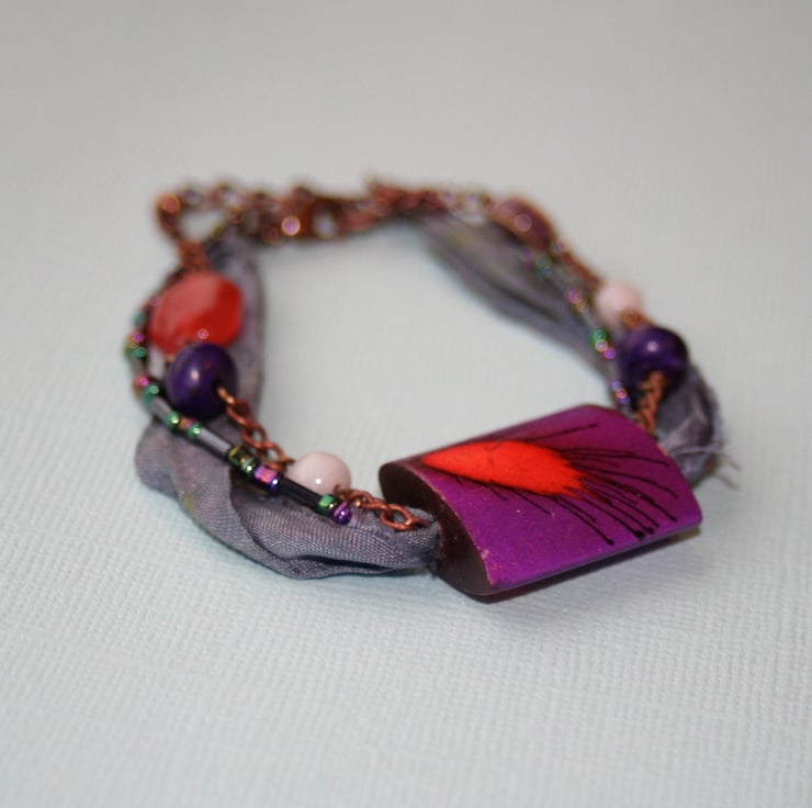 Boho-inspired multistrand bracelet with a unusual purple and orange painted wooden focal bead. One strand is made with seed beads, another with ceramic and gemstone beads (purple magnesite and orange agate). A length of blue/purple sari ribbon adds to the the bohemian look.