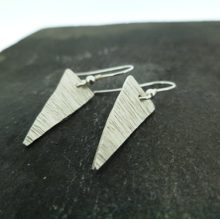 Made from 1mm thick sterling silver sheet and textured by hand these little triangles are attached to sterling silver hook wires. Great for day or evening wear.