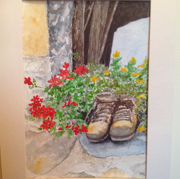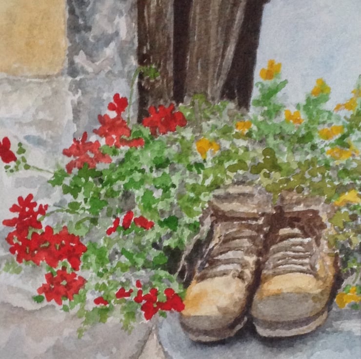 Geraniums bring a burst of colour to pots and patios. I thought that the boots made a very unusual container and great inspiration for a painting!