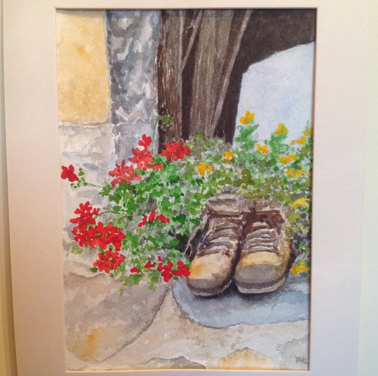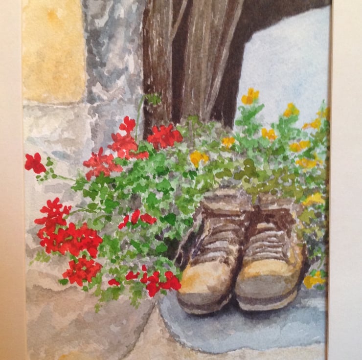 An original watercolour painting of scarlet geraniums planted in a pair of old leather boots, making a quirky display on the barn windowsill.