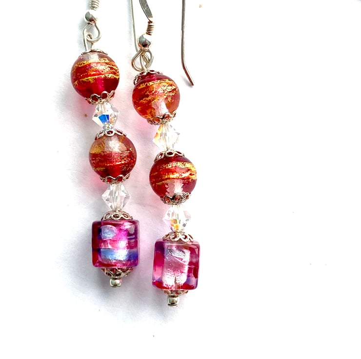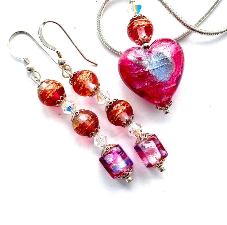 Murano glass jewellery set with a pure silver foiled pink and blue Murano Glass heart which hangs from a sterling silver chain (18ins). The earrings have 24k gold foiled Murano Glass round beads and cube beads and hang from sterling silver ear wires and measure 40mm in length excluding wires. The beads are beautiful and rich in colour enhanced by silver findings. The set is presented in a velver gift pouch.
