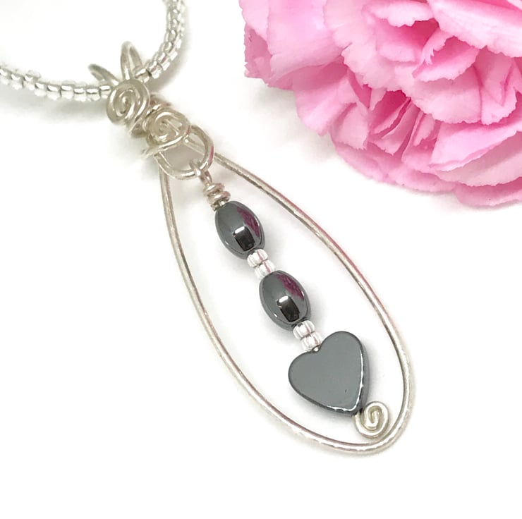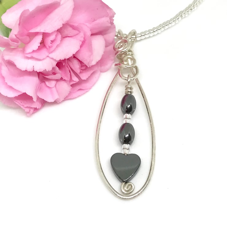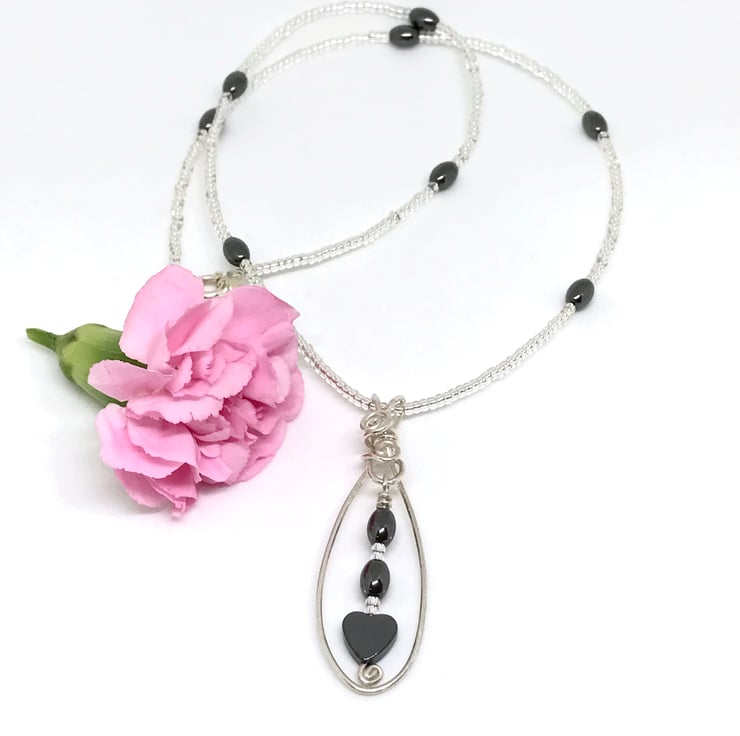 I have formed sterling silver wire into an oval shape with a centre drop of hematite heart and oval shaped beads and silver lined seed beads.
