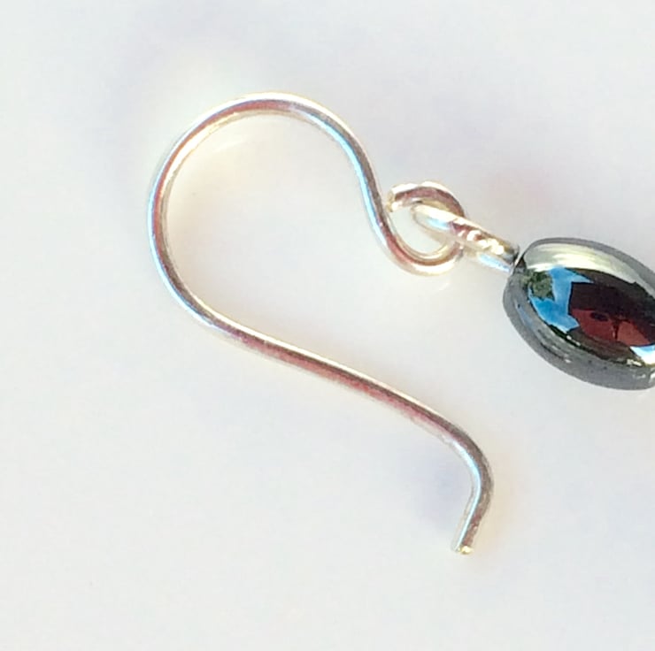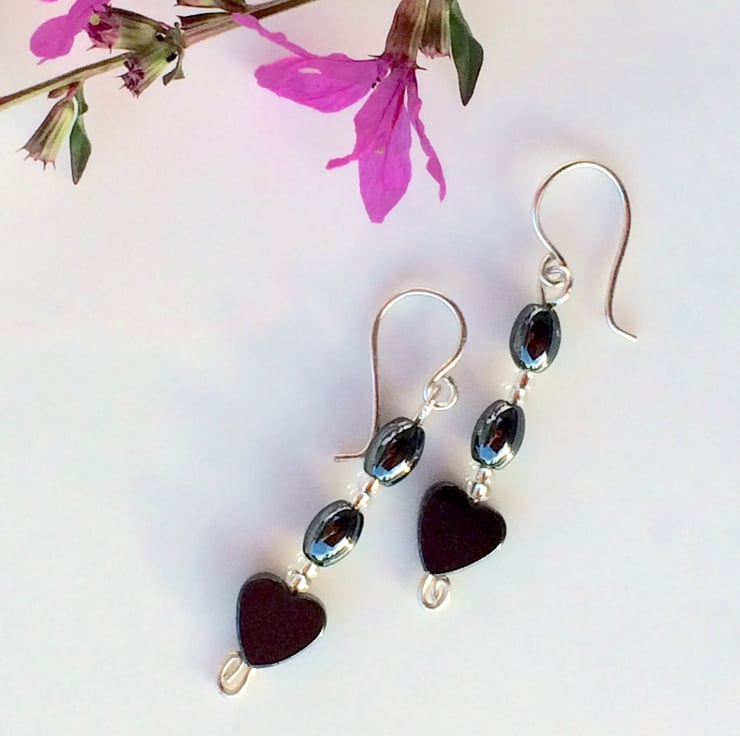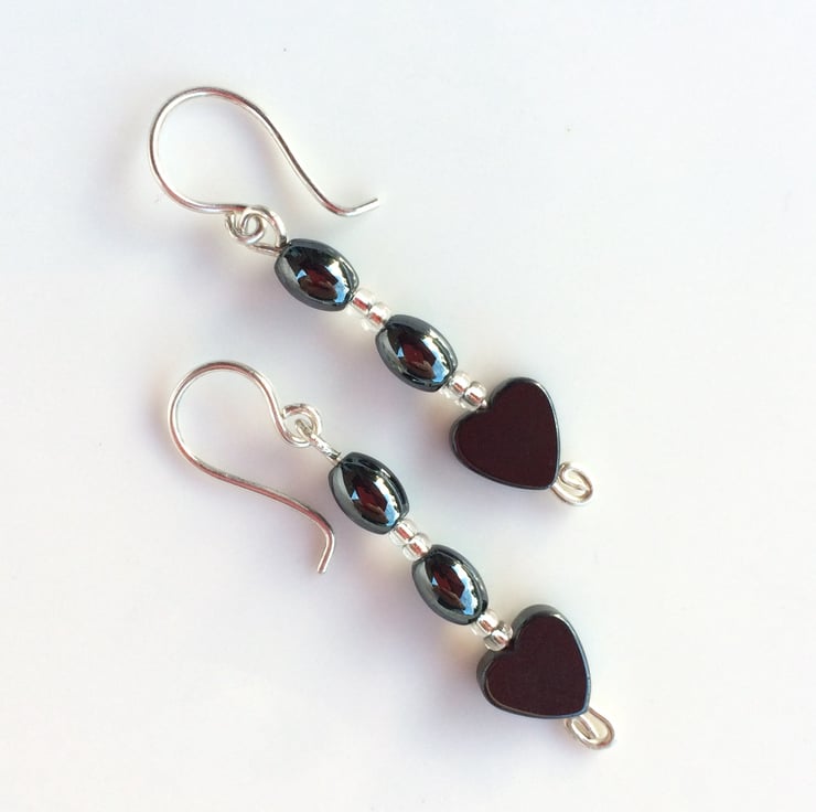 I have made these pretty earrings with sterling silver, heart and oval shaped hematite beads and silver lined seed beads. The earring wires have been handcrafted from sterling silver.