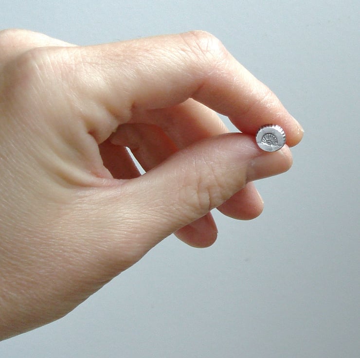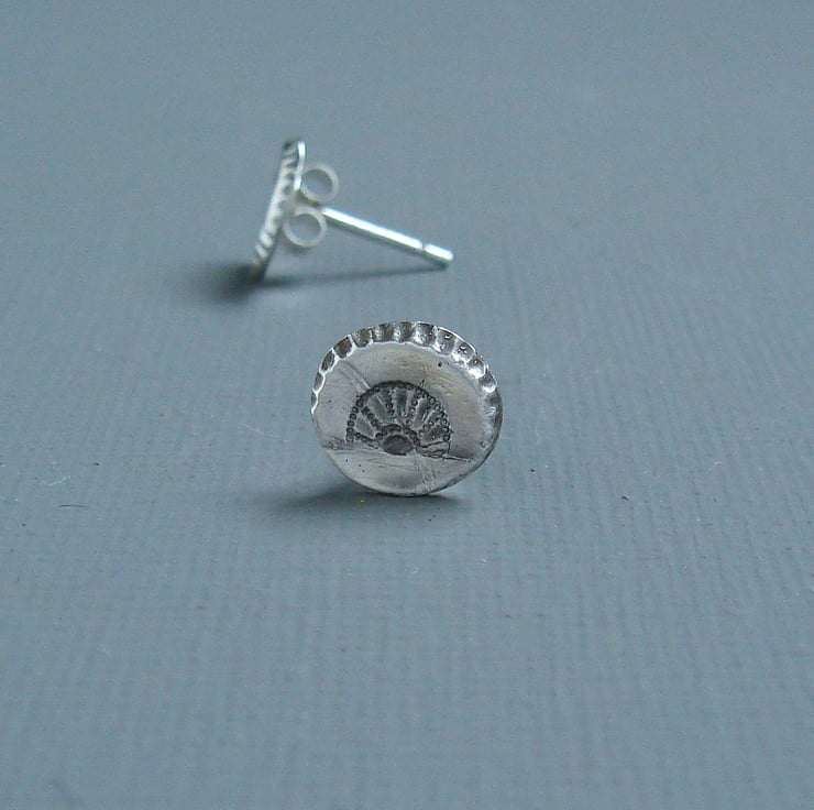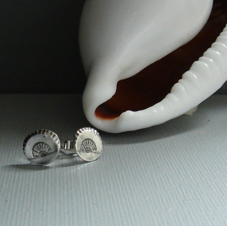 These vintage style stud Earrings have been cast from a genuine Art Deco button and depict a tiny fan, an iconic design of the 1920's. They are hand cast from sterling silver here in my West Sussex workshop and have butterfly backs to fasten them securely. At only 9 mm (3/8") wide and 8 mm high they add a delicate vintage touch to any outfit. The front surface has been polished smooth and antiqued to bring out the details of the design, with the reverse given a brushed finish.