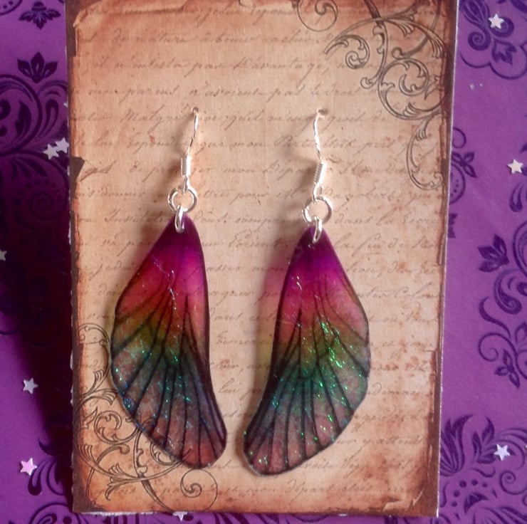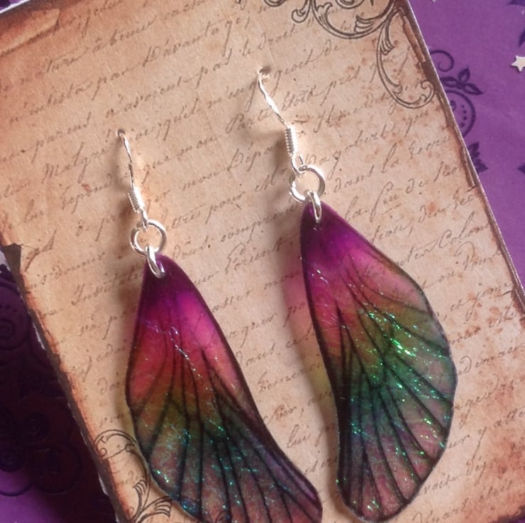 Iridescent fairy wing earrings made from layers of acetate.