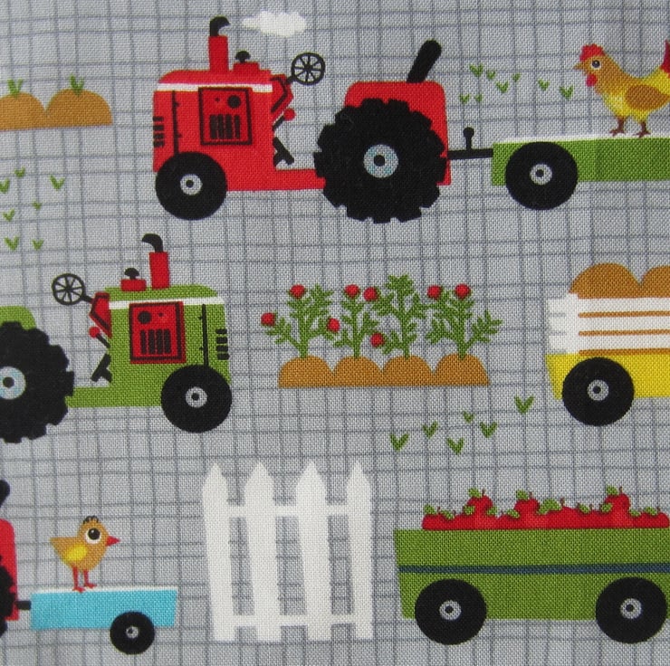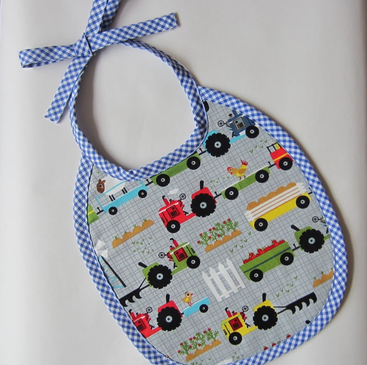Babies bib featuring tractors, chickens and a sheep. Edged in blue check gingham and backed with white towelling. Suitable for babies aged about 6 to 12 months. It measures 23.5 cm wide and 26.5 cm long. Fastens with a bow at the back of the neck.