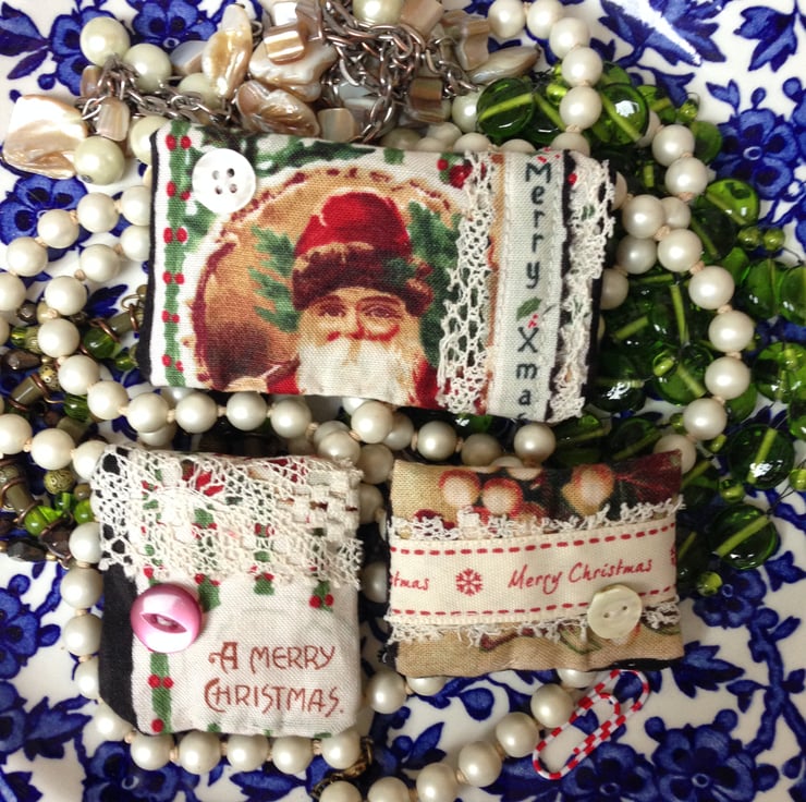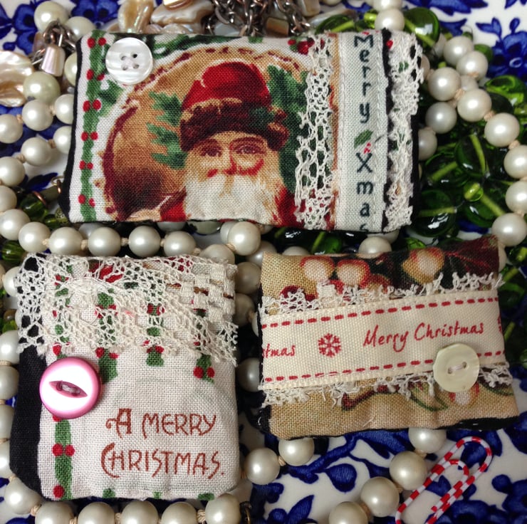This listing is for three mini gingerbread scented bags which are embellished with a merry Christmas message , lace and a vintage button .