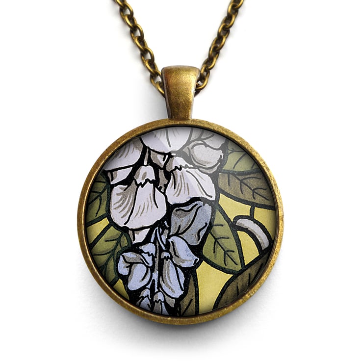 A gorgeous necklace featuring an art nouveau illustration of wisteria flowers. This design is part of the 'Art Nouveau' range.