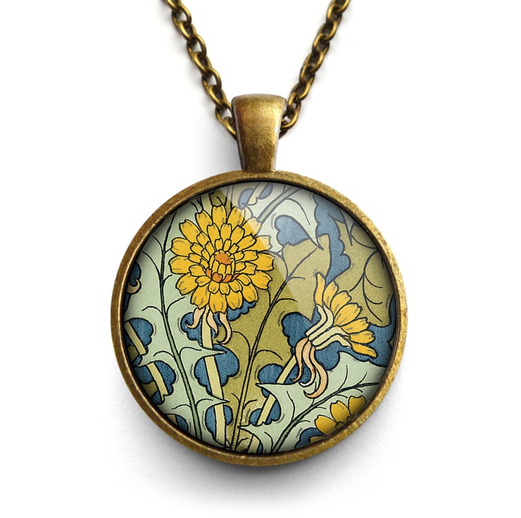 A gorgeous necklace featuring an art nouveau illustration of dandelion flowers. This design is part of the 'Art Nouveau' range.