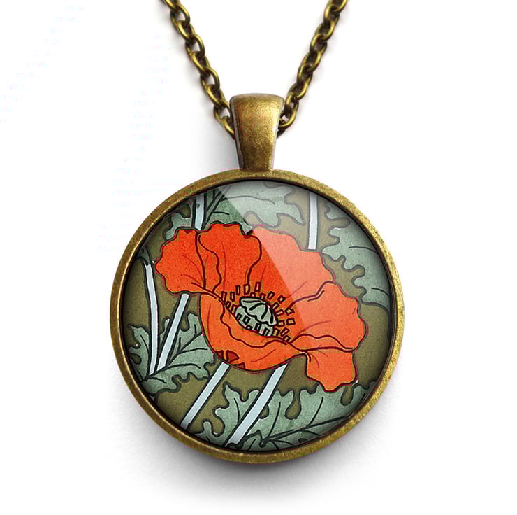 A gorgeous necklace featuring an art nouveau illustration of a red field poppy. This design is part of the 'Art Nouveau' range.