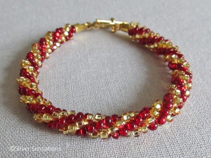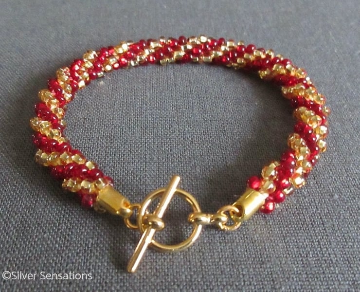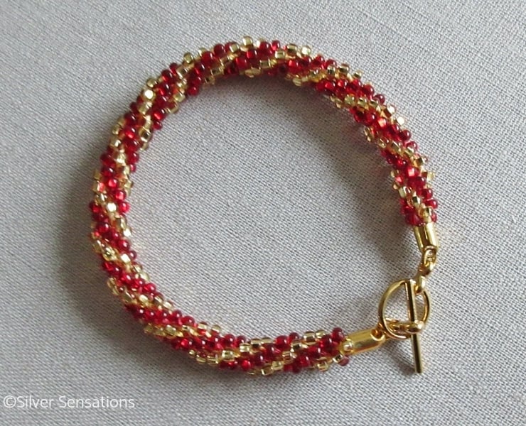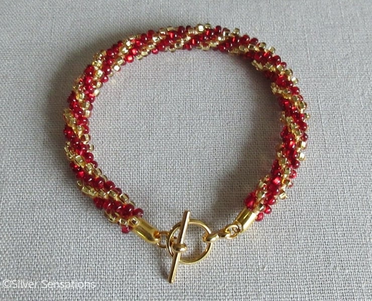 Rich ruby red & golden 3mm Preciosa glass beads make up this handmade Kumihimo seed bead fashion bracelet.