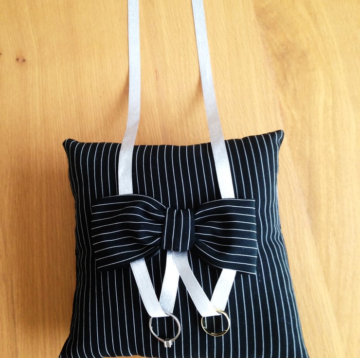 The cushion is hand-cut from black polyester cotton with a fine white pin stripe and is firmly padded with hollow fibre filling. It has two silver coloured ribbons looped through the centre bow.