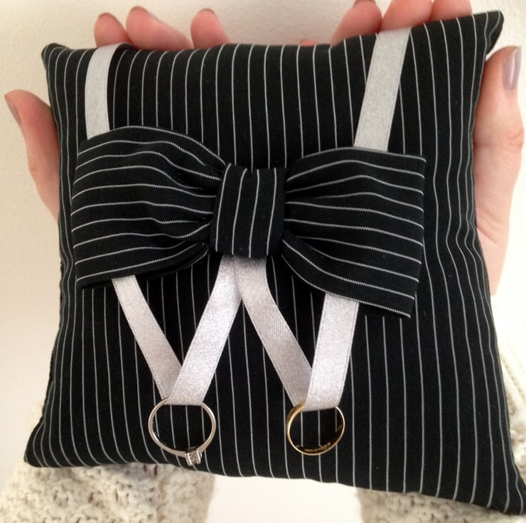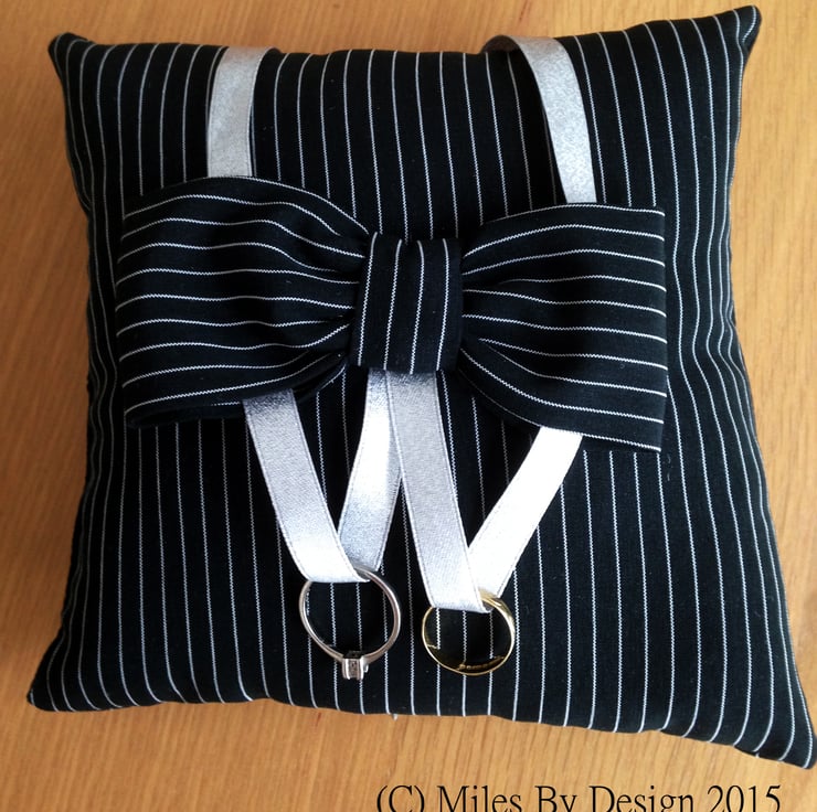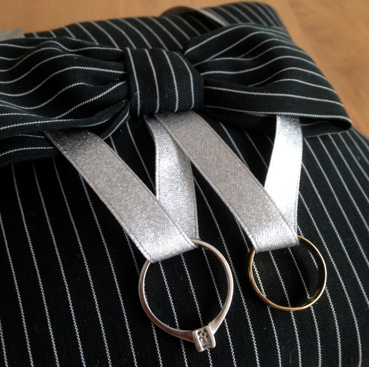 Sometimes brides or grooms don't like a traditional wedding with all the usual feminine flourishes. So I thought that this smart pinstripe would be more in keeping. I also looped the ribbons instead of tying them for easier removal as at a recent wedding there was an embarrassing wait as they tried to untie their rings from the high street shop ring pillow that they had purchased.